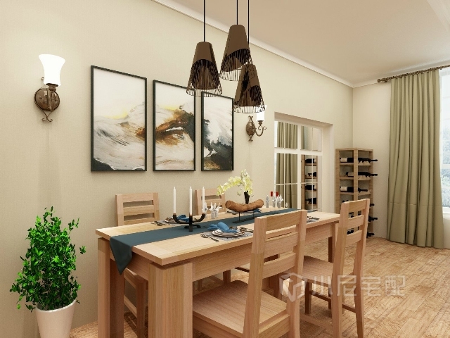 金屬長線吊燈,現(xiàn)代的裝飾畫,簡約的餐桌椅,增加了時尚感。