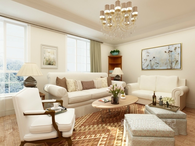 白色的沙發(fā)搭配淡藍色碎花沙發(fā)凳,白色的墻搭配草綠色的窗簾,顯得干凈簡潔。