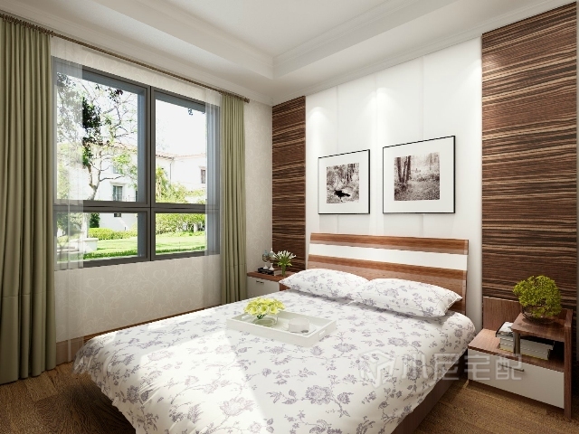 木飾面的造型和床頭巧妙地呼應(yīng),淡綠色的窗簾為整個臥室增添一絲清新的味道。