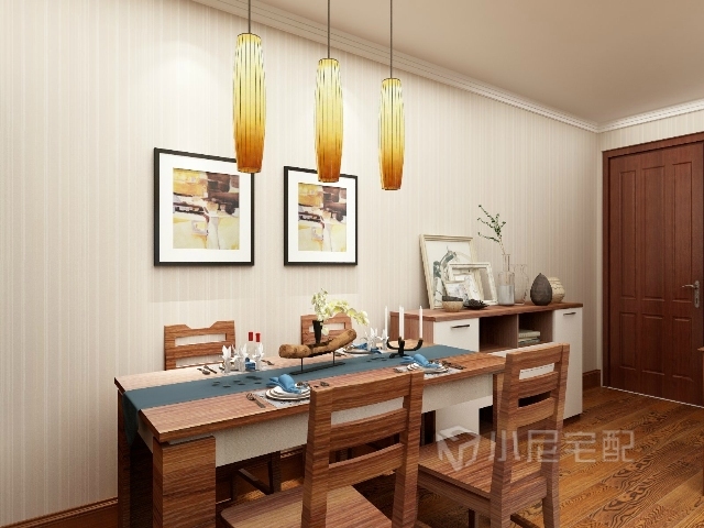 簡單的掛畫,橘色的長線吊燈,淡雅的條紋壁紙,一套餐桌椅,一個餐邊柜就營造了一個非常舒適的就餐環(huán)境。