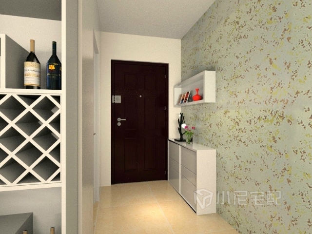 入戶門口放一簡(jiǎn)單鞋柜,上面為隔板柜點(diǎn)綴。