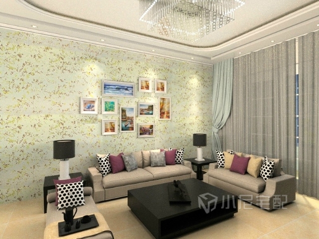 沙發(fā)墻主要也是彩粒漆加照片墻簡(jiǎn)單裝飾。
