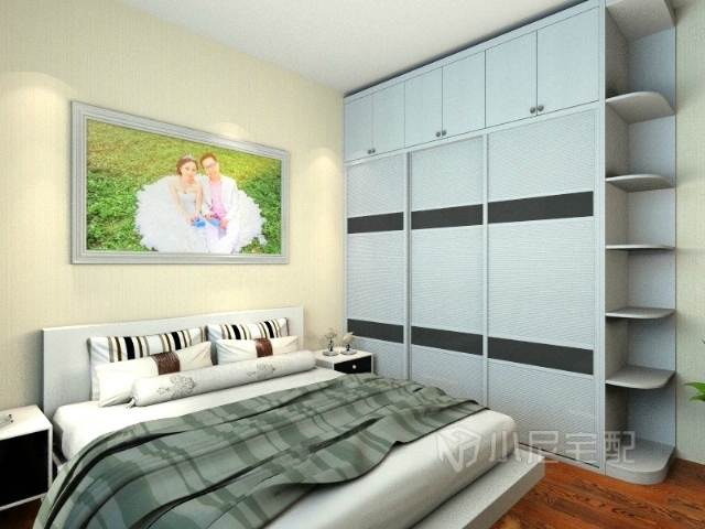 主臥簡(jiǎn)單的一張床,一個(gè)衣柜,床頭為婚紗照掛墻裝飾,進(jìn)屋主人心情舒爽。