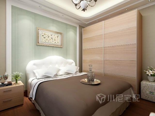 淡綠色的臥室背景墻搭配白色軟床,推拉門的衣柜,材質(zhì)多樣,溫馨舒適。