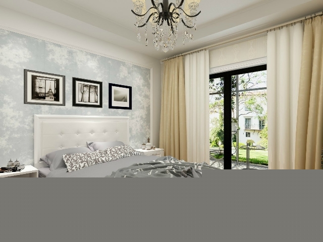 淡藍(lán)色的臥室背景墻搭配現(xiàn)代風(fēng)格的裝飾畫,淡黃色的床尾凳與窗簾相搭配,溫馨舒適。