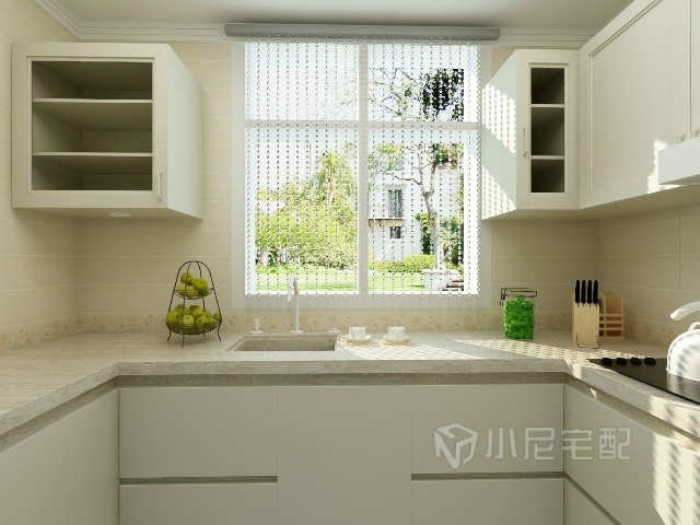 廚房選用造型簡約的櫥柜,沒有多余的造型裝飾,晶瑩剔透的珠簾增加了一絲小清新的感覺。