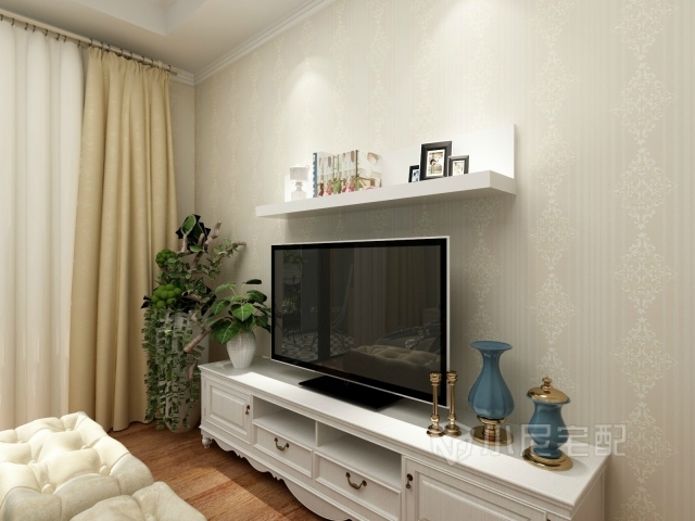 田園風(fēng)格的電視柜,加上一個壁架,一個綠色的花瓶裝飾,讓整個臥室更加貼近自然。