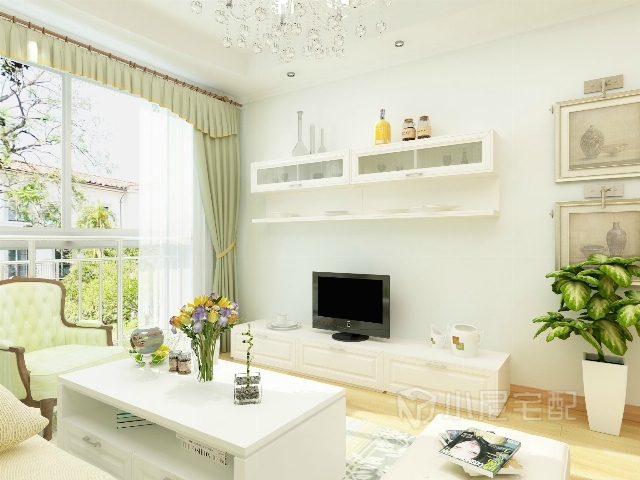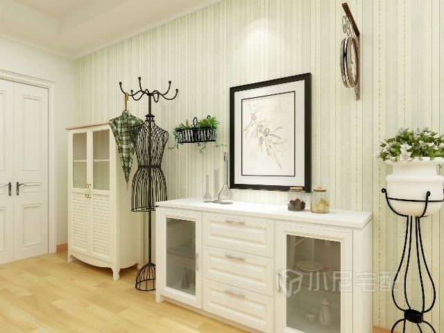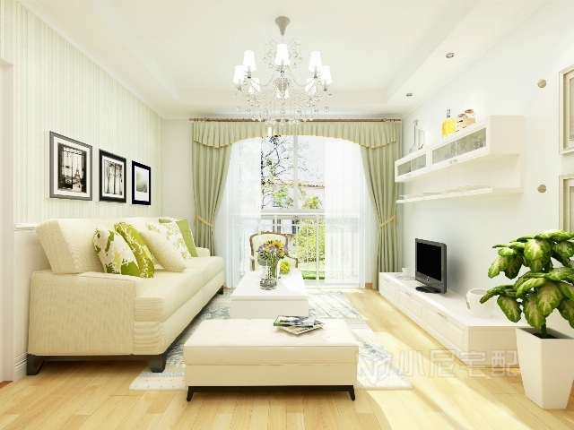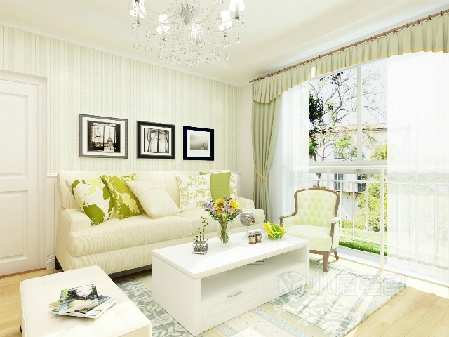 白色的護墻板,白色的布藝沙發(fā),綠色條紋壁紙,綠色花紋的抱枕與窗簾,做到色彩上的呼應。