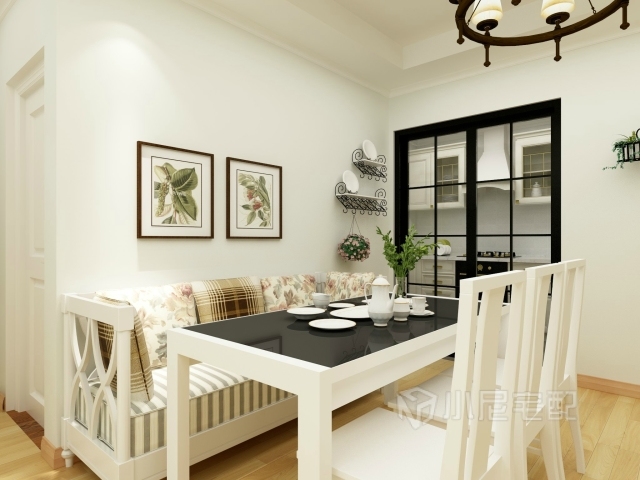 餐廳部分使用卡座增加舒適感,綠植裝飾畫和壁架上的小盆栽打造濃濃田園風。