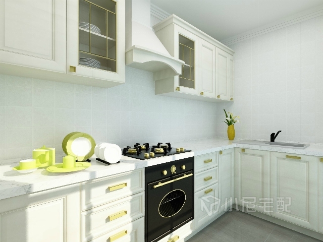 乳白的櫥柜組合,白色的臺面,功能齊全又安靜整潔。