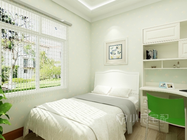 次臥選用淡綠色壁紙,顯得空間開闊,晶瑩的珠簾使房間更加通透。