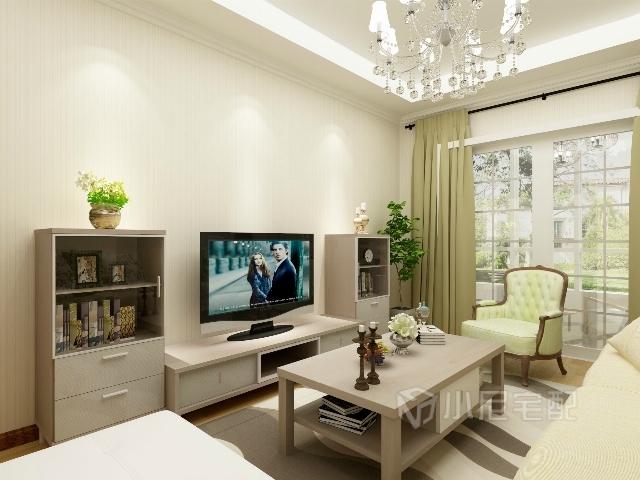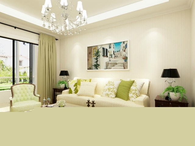 綠色的沙發(fā)抱枕和窗簾相呼應(yīng),白色的布藝沙發(fā)黑色的邊幾,舒適又時(shí)尚。