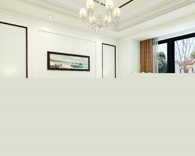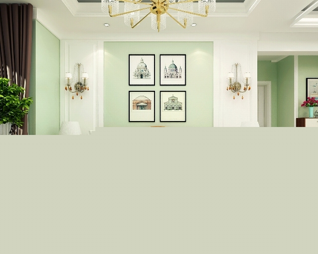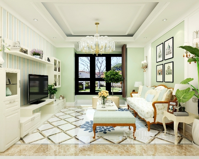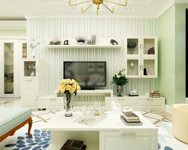 淡綠色的壁紙,既環(huán)保又養(yǎng)眼。歐式碎花沙發(fā),白色的茶幾和木飾面板,清新簡潔自然。