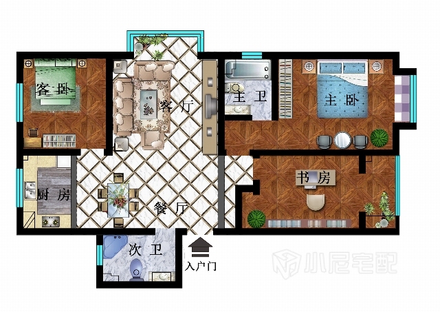 拼花地磚顯得高貴奢華,大大的落地窗讓整個空間通透明亮。