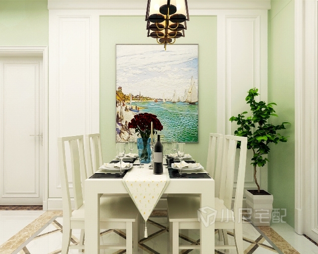 大幅的海濱裝飾畫,黑白的餐桌椅搭配金屬吊燈,溫馨而時尚。
