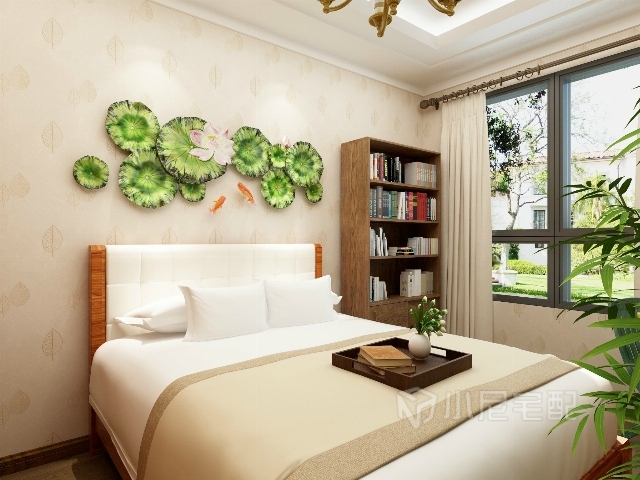 舒適的軟包床頭,荷葉鯉魚的裝飾掛件,鮮艷輕快,顯得十分清爽。