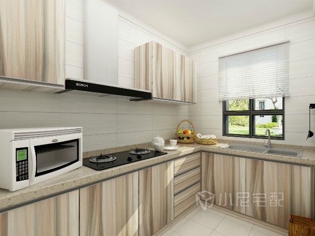 造型簡潔的L型櫥柜組合,不浪費一平米,合理利用空間,顯得十分整潔干練。