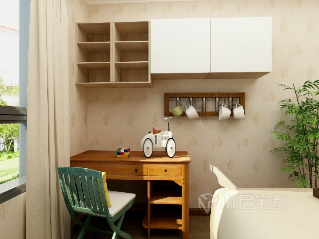 復(fù)古的書桌椅,簡潔造型的吊柜,打造一個工作學(xué)習(xí)的舒適的小空間。