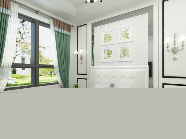 簡潔造型的背景墻,綠色的窗簾與綠葉的裝飾畫相呼應(yīng)。