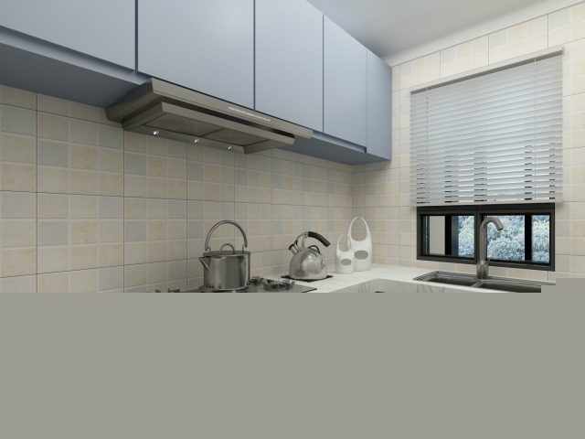 淡藍(lán)的的櫥柜組合,搭配暖色的墻磚,冷暖結(jié)合,溫馨宜人。
