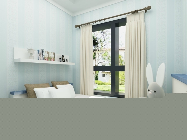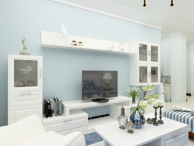 淡淡的藍(lán)色的背景墻與白色簡潔的電視柜搭配,清新柔和。