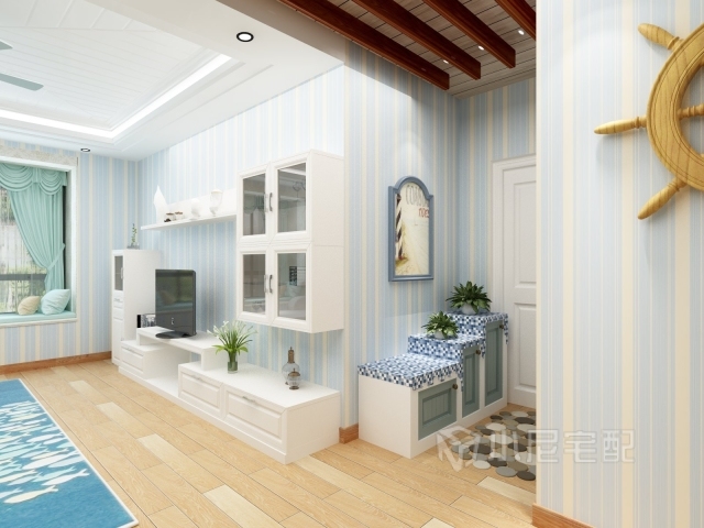 玄關(guān)處的設(shè)計(jì)采用藍(lán)白相間的色彩搭配,屬于地中海的典型特色