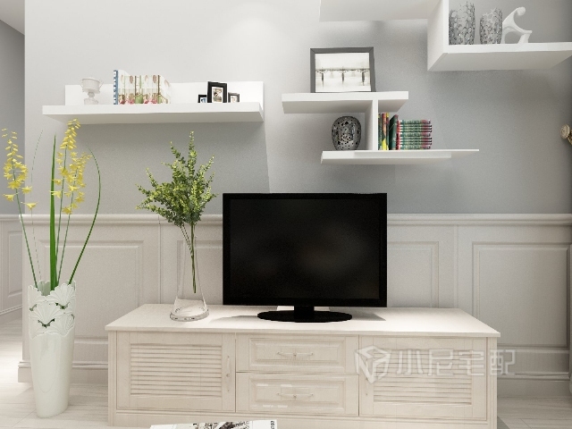 電視背景也沒多做修飾,放置幾個擱板增加儲物功能即可