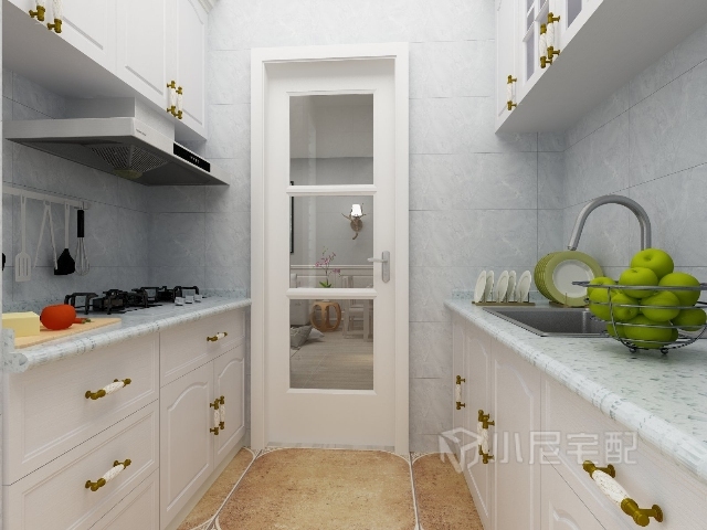 廚房的墻磚和臺面都采用了淡藍(lán)色的設(shè)計,清新自然