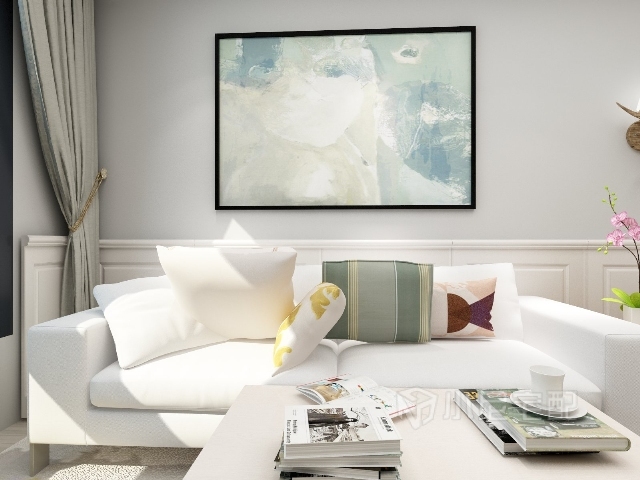沙發(fā)背景采用了一幅大的抽象畫,顯得空間很整體,一點也不瑣碎