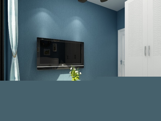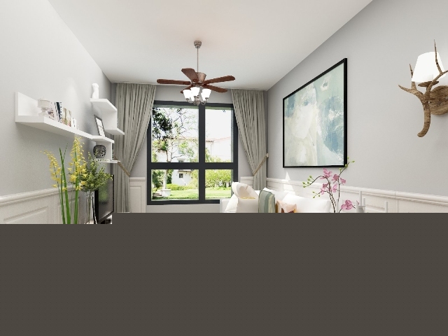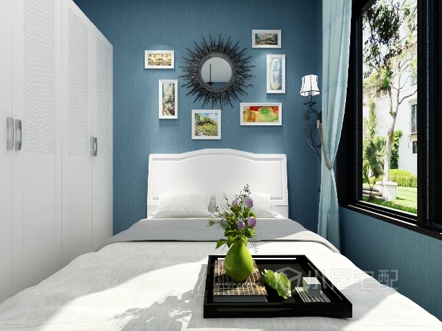 從窗戶看進(jìn)來,湖藍(lán)色的墻面背景很有美式的特色