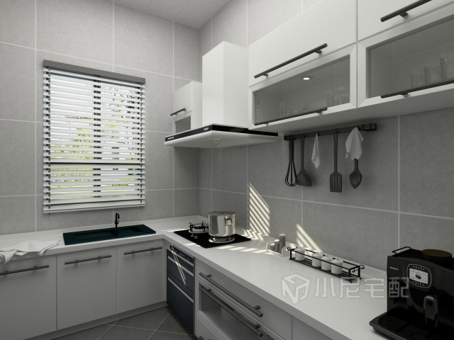 廚房白色柜體搭配淺灰色墻面,干凈整潔,功能設(shè)施齊全。