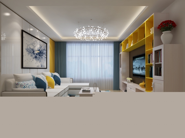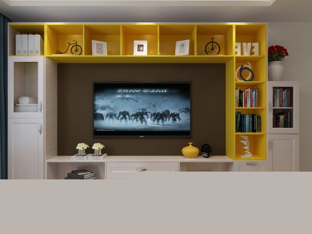 整面墻定制柜體,明黃色點綴著客廳空間,活力十足。