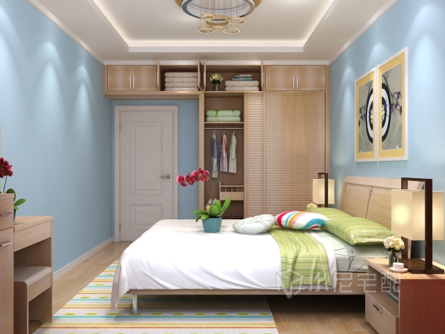 7字型的到頂大衣柜滿足主人的收納需求。百葉門板使得整個(gè)臥室提升了一個(gè)檔次。