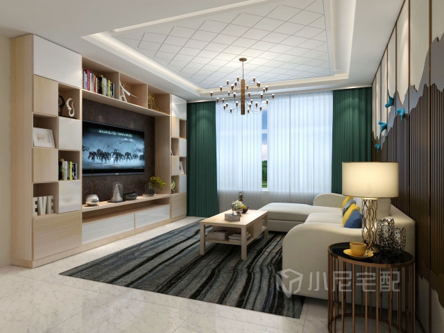 整面墻的電視柜帶來超大儲(chǔ)物空間,開放式與封閉式結(jié)合,有露有藏。