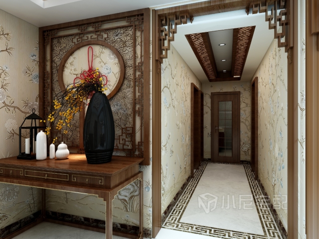 走廊簡(jiǎn)簡(jiǎn)單單,壁紙和吊頂相互呼應(yīng),簡(jiǎn)約的表達(dá)著整屋的中式氛圍。