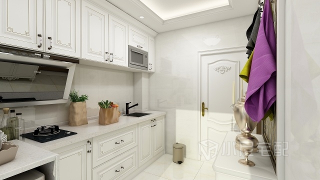 廚房采用防水石膏板,櫥柜為白色鑲金邊柜門簡單漂亮