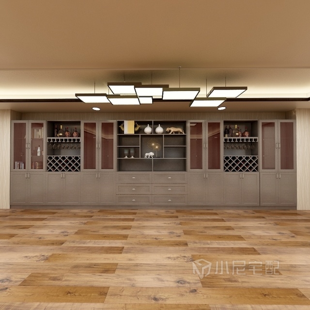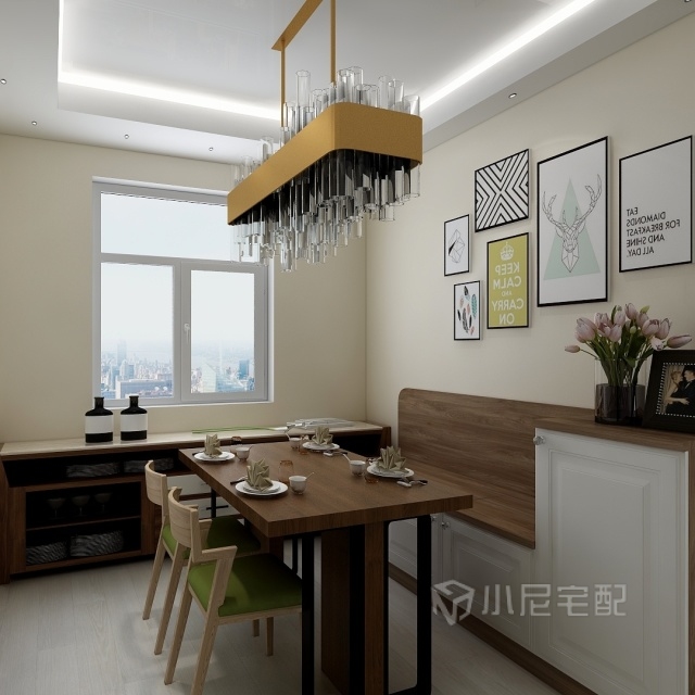 餐廳深胡桃色,搭配米黃色墻面,穩(wěn)重不失活潑