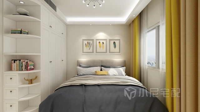 臥室整體灰色相呼應(yīng)亮黃色點(diǎn)綴