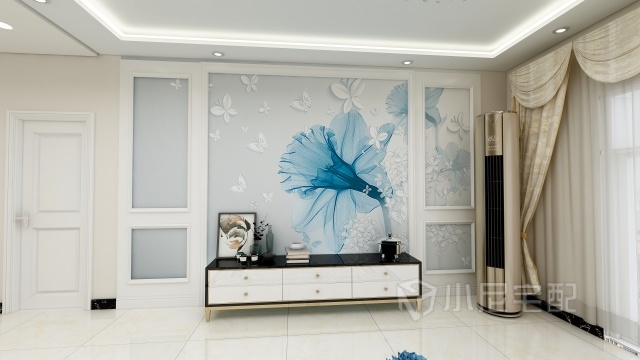客廳電視背景墻上的藍色花瓣加上偏偏飛舞的蝴蝶好似置身于花海般 好想深深的呼吸一口新鮮空氣