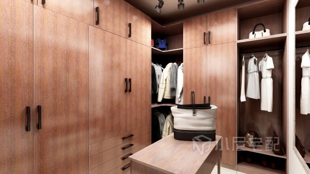 L型的衣柜保圍著中間的梳妝臺,為化妝與試穿提供寬敞的空間和氛圍。
