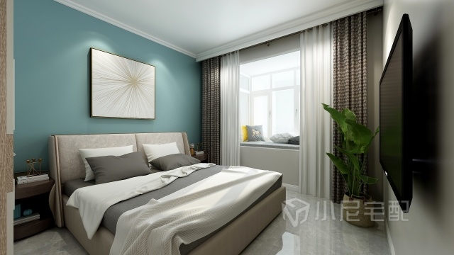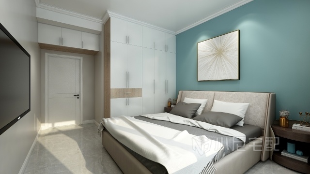 主臥以溫和的藍(lán)色為背景色,沒(méi)有多余繁瑣的線條,給人明凈清朗、如沐春風(fēng)的感覺(jué)。