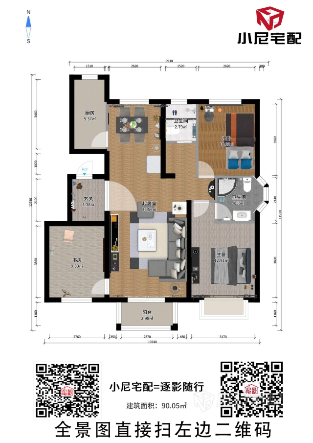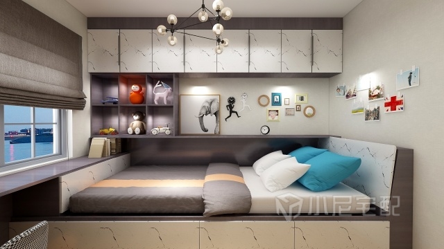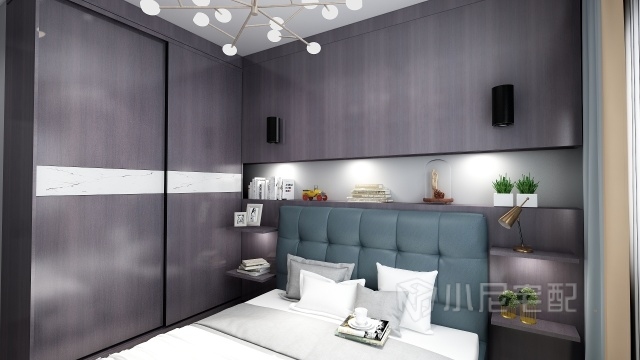 次臥辦公,休息,收納于一室,讓每一寸空間物盡其用。單區(qū)間的圍合空間,采用立體式環(huán)抱包圍,在風水上叫藏風聚氣
