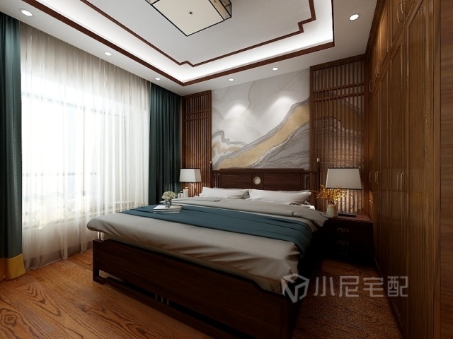 主臥室的背景墻用木質(zhì)的花格搭配抽象圖案的壁畫,讓空間具有了視覺焦點(diǎn)。