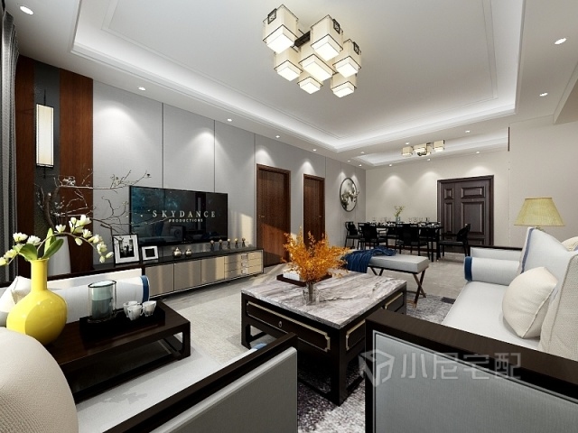 客廳電視背景墻與餐廳背景墻用硬包與黑色金屬條的銜接是使空間看的更加整體連貫。