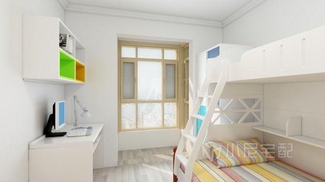 兒童房放置上下床節(jié)約空間,套色書桌配合藍(lán)白衣柜,給孩子一個多彩的空間