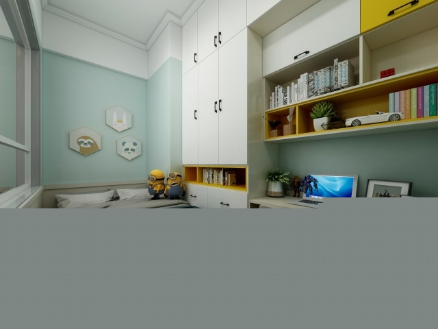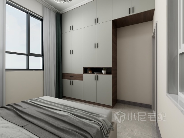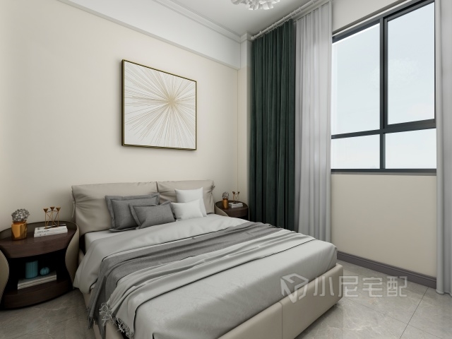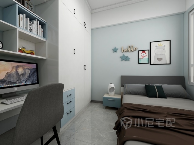 我我們再來看看臥室,臥室里里面的白色頂面與深木色地面有著“天輕地重”的舒適視覺感,墻面涂裝了淡淡的淺灰色,與白色吊頂拼接的相得益彰很舒適、溫和,并在床頭左右上方安裝黑色壁燈,讓墻面裝飾效果形成黑白對比的層次美感。深棕色木質(zhì)雙人床+床頭柜+邊幾,顏色深重與木地板相呼應,用淺色鈷藍+白色床品來裝點。白色的臥室衣柜嵌入式設計在淺灰色墻面內(nèi),三柜一體設計簡單而直接,力求功能、實用。衣柜旁邊的淺灰色墻面用一幅現(xiàn)代掛畫來裝點便已足夠,盡顯臥室空間的干凈與舒適。