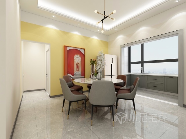 這是餐廳,可以看出餐廳裝修手法延續(xù)了客廳的手法,每一處都充滿著簡約時尚的氣息。一側(cè)墻面設計了一整排簡潔干脆的墻柜,充分將收納功能做到最大。對墻面用規(guī)格相同的木框掛畫來裝點綴飾,很好的避免了白色墻面的單調(diào)感,左右墻面整體上看很是豐富、自然,且符合現(xiàn)代簡約風格的裝飾特點。六人座的餐桌椅是采用實木+玻璃材質(zhì),現(xiàn)代質(zhì)感極佳,在玻璃桌面上擺上一大束跳舞蘭,豐富空間顏色的同時還帶來了幾分活潑之感,讓人的心情倍感愉快。上方兩盞黑色金屬吊燈有種工業(yè)風的味道,正好和玻璃材質(zhì)的裝飾韻味很相搭,給人一種協(xié)調(diào)的美感。