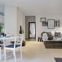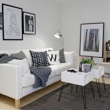 這套案例很有北歐瑞典風(fēng)情,全屋選用白色為主色調(diào),讓空間增加寬敞感。家具幾乎全部為黑白(灰)搭配,對(duì)比效果明顯。家具造型簡單,突出硬朗的線條,給人干凈利落的感覺,突出主人時(shí)尚的生活品味。白色給人潔凈明朗的感覺,同時(shí)還能增強(qiáng)空間感??蛷d配備了充足的燈飾,采光條件極好。簡單的沙發(fā),特色小茶幾,組合黑白相框,讓客廳充滿時(shí)尚個(gè)性。