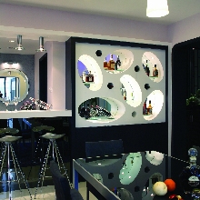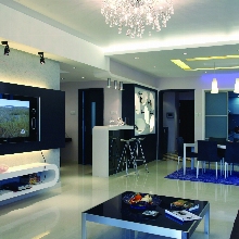 酒柜及沙發(fā)背景墻飾橢圓形蜂巢的奇特造型寓意專(zhuān)為新婚業(yè)主打造的甜蜜“愛(ài)巢”。而隱含在空間各部位的“L”造型元素是將男女主人姓氏拼音首位字母與他們的新居巧妙地結(jié)合在一起,全屋紫灰熏衣草色系綴以藝術(shù)玻璃、灰鏡等材質(zhì),營(yíng)造出對(duì)比強(qiáng)烈的時(shí)尚氣息,彰顯出業(yè)主的不凡品味。家裝家具一體價(jià):19萬(wàn)。