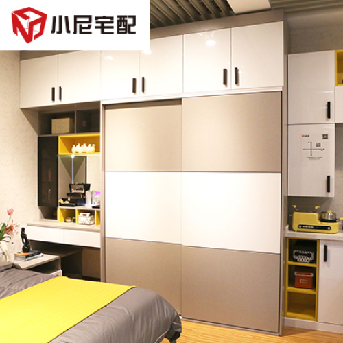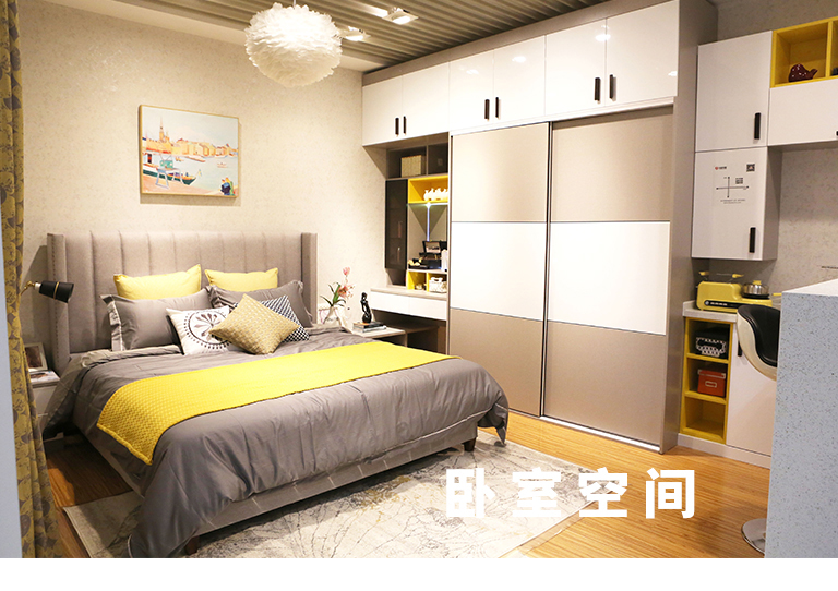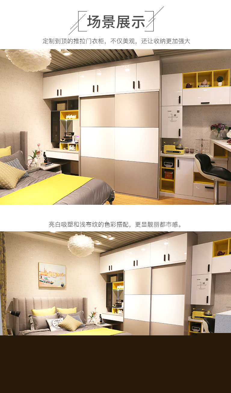 | 細(xì)節(jié)描述 | 定制到頂推拉門衣柜,亮白吸塑和灰布紋的搭配,較之純木色家具更為年輕,都市感更強(qiáng)。床頭柜妝臺(tái)L型拼搭,更顯整體。梳妝臺(tái)化妝品可以分區(qū)放置,生活更精細(xì)化。多工能魔鏡,顯示溫度濕度,方便出門的時(shí)候搭配適當(dāng)?shù)囊挛?,藍(lán)牙播放器功能,讓生活更有品味和樂趣。 |